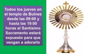 A partir de hoy jueves 11 de abril de 2024, desde las 09:00 y hasta las 19:00 horas, y en adelante todos los jueves en este mismo horario, en el templo parroquial de Bulnes estará expuesto el Santísimo Sacramento del Altar, para que los fieles puedan acudir a adorarlo. Para evitar que el Santísimo esté solo, se ha hecho correr una lista entre los fieles para que se anoten por hora, y ya están todas las horas del día cubiertas.