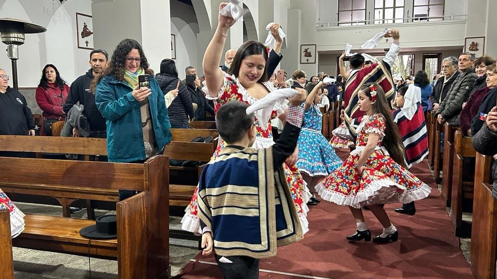 Hermosa misa a la chilena en el templo parroquial de Bulnes, hoy domingo 10 de septiembre a las 11,30 horas. Al final de la misa, integrantes del grupo folclórico Valles del Larqui, bailaron un pie de cuecas