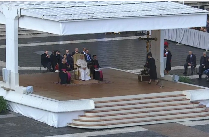 Ante los peregrinos congregados en la Plaza de San Pedro en el Vaticano durante su Audiencia General de este...